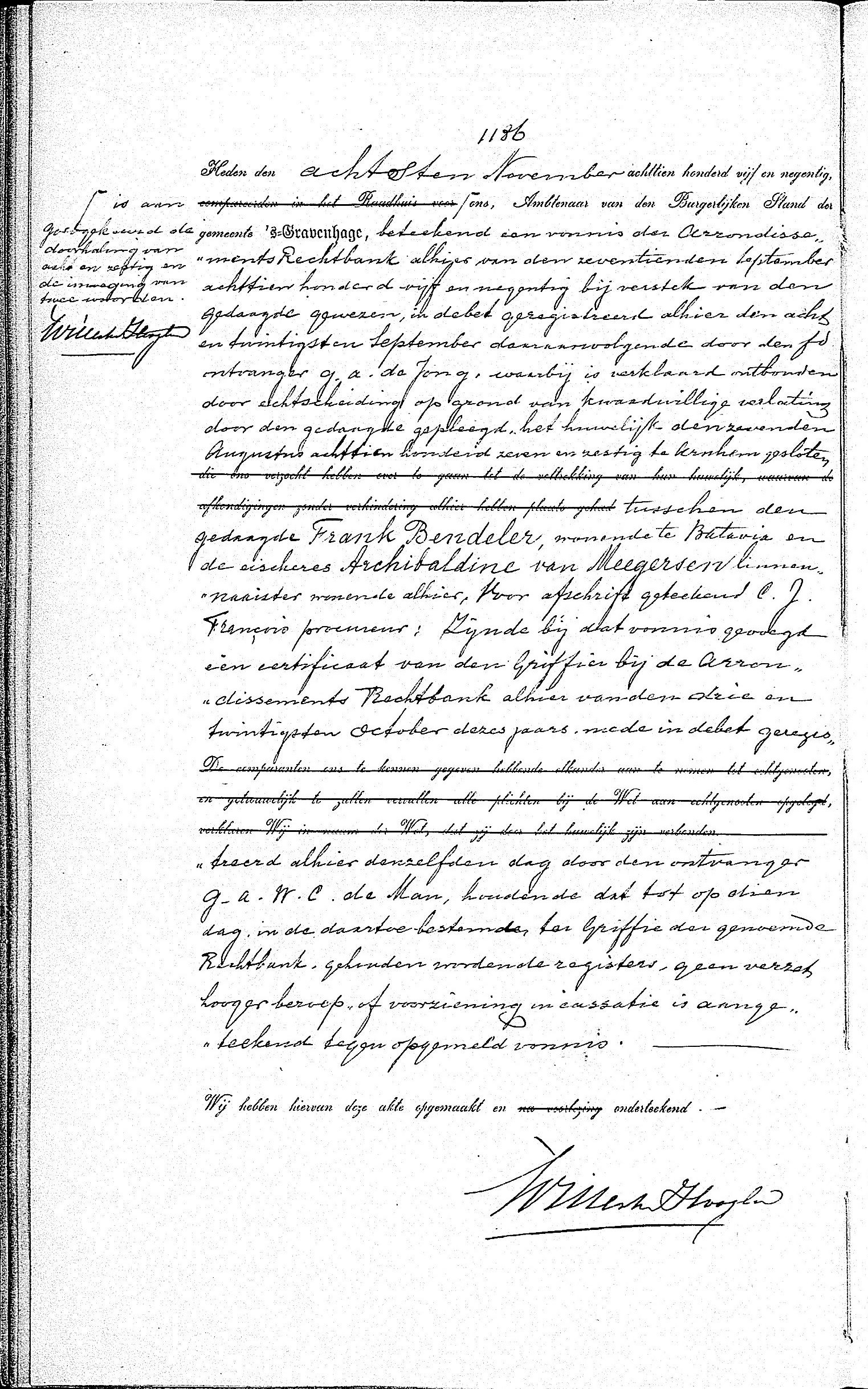 Scheidingsakte Frank Bendeler en Alchibaldine van Meegersen 1895