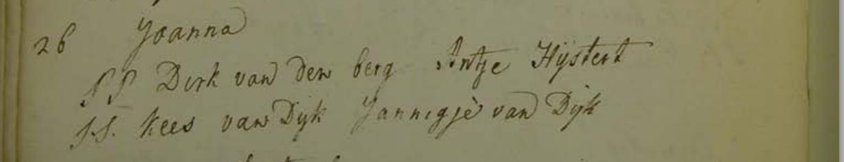 | Doop van een dochter | Adriana van den Berg 14 mei 1777 (Leeftijd 31 jaar) Bron: www.vpnd.nl Details citaat: Aarlanderveen Dopen RK 1765-1777 (10a) |