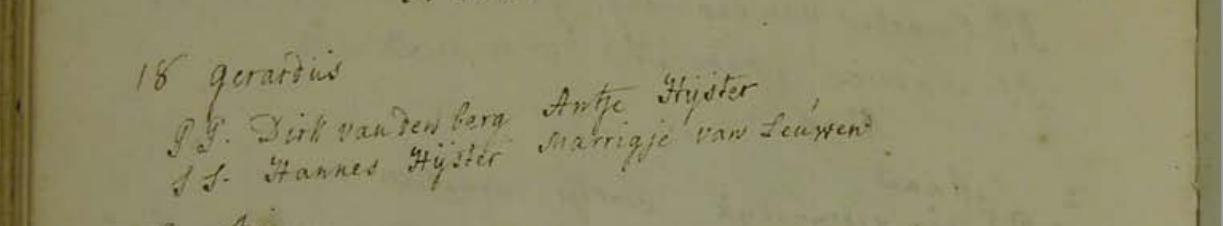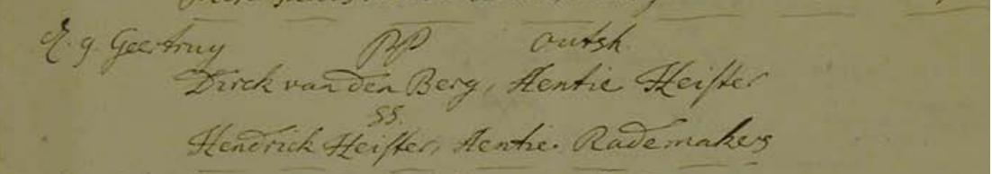 | Huwelijk | Dirk van den Berg — Bekijk dit gezin 31 mei 1772 (Leeftijd 26 jaar) Huwelijksregister Aarlanderveen Dirck van den Berg en Aentie Heister 31 Mei 1772 Notitie: Getuigen: Frans Bosman en Marijtie Hartsprong |