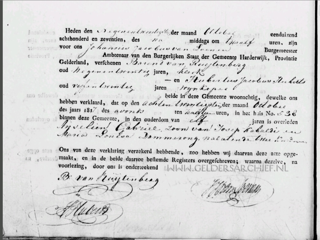 Anselien Gabriel Cabalt (Kabaldi) Geboren: 1806 44 36 Overleden: 28 oktober 1817 — Harderwijk (Gelderland) |
