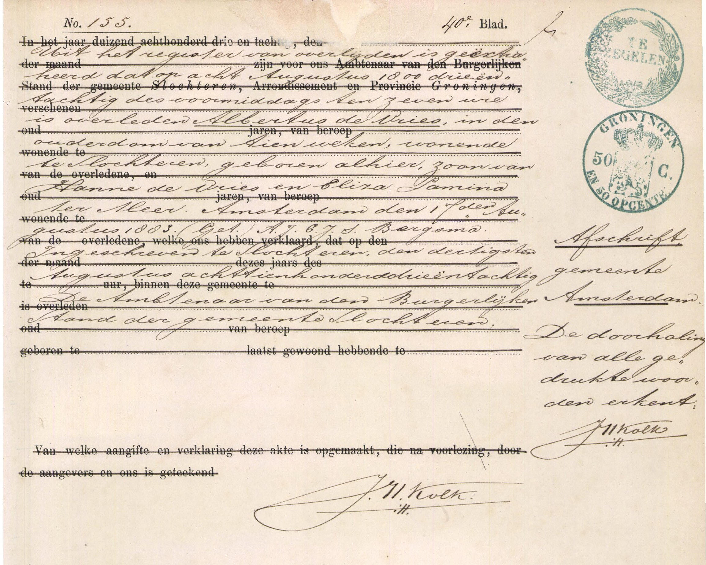 Albertus de Vries Geboren: juni 1883 36 38 — Slochteren (Groningen) Overleden: 8 augustus 1883 — Amsterdam (N-H) |