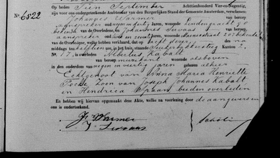 | Overlijden van een broer | Albertus Cabalt (Kabalt) 8 september 1894 – 21:30 (Leeftijd 40 jaar) Adres: Suikerbakkersteeg Kanton 2, nr.17 |