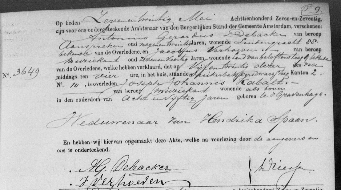 | Overlijden van vader | Josephus Joannes Cabalt (Kabalt) 25 mei 1877 (Leeftijd 22 jaar) Adres: Suikerbakkerssteeg, kanton 2, nr. 10 |