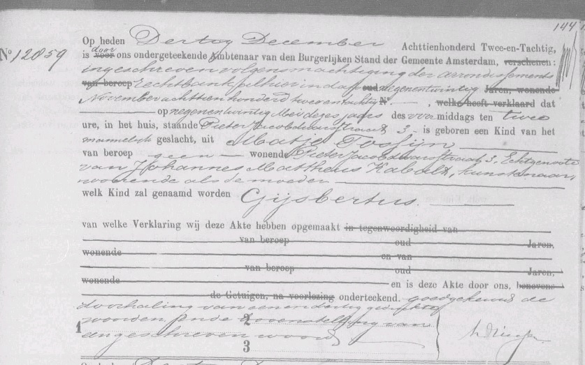 | Geboorte van een kleinzoon #4 | Gijsbertus Cabalt (Kabalt) 29 mei 1882 – 02:00 (Leeftijd 61 jaar) Adres: Pieter Jacobdwarsstraat nr. 3 |