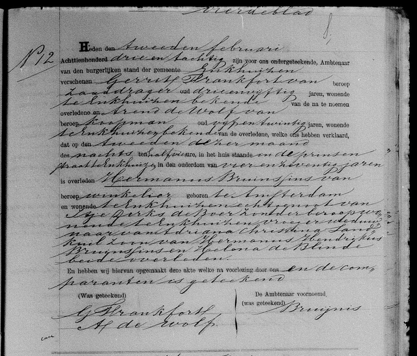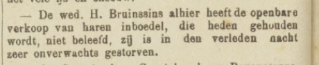 | Overlijden van een echtgenoot | Hermanus Bruinsins 2 februari 1883 (Leeftijd 71 jaar) Adres: Prinsenstraat |
