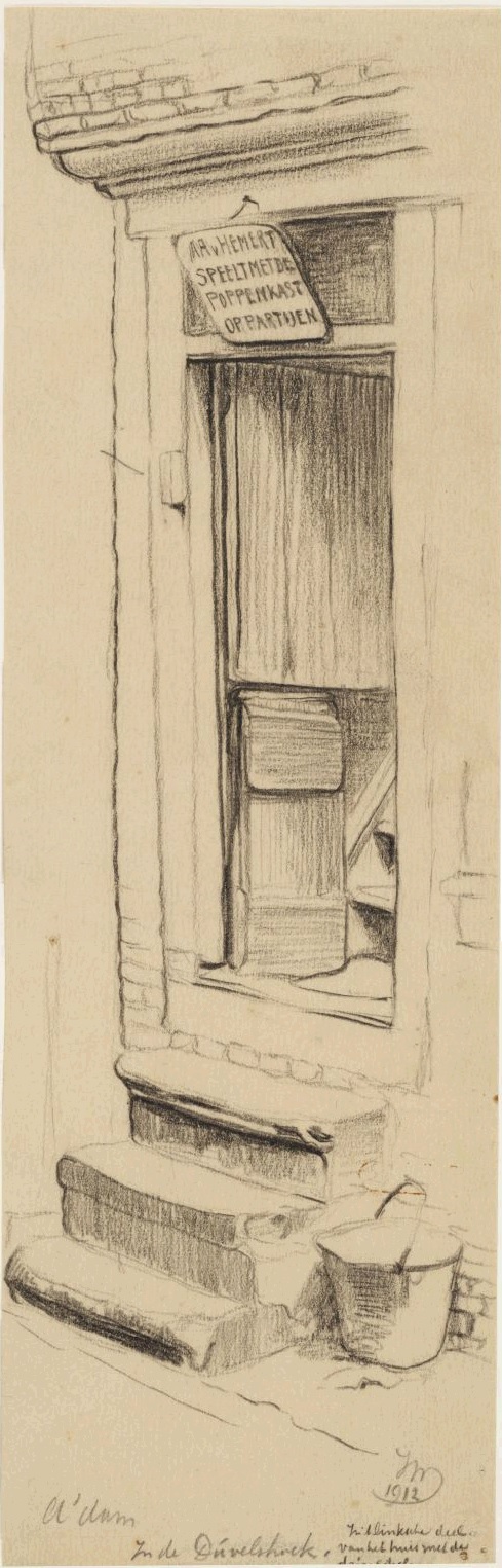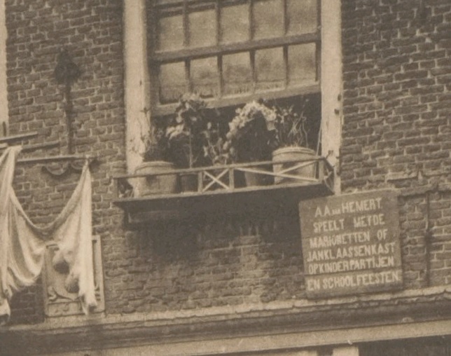 | Media object | Formaat: image/jpeg Afmetingen afbeelding: 580 × 898 pixels Bestandsgrootte: 176 KB Soort: Foto Gemarkeerde afbeelding: nee Notitie: Blindemansteeg 19, Duivelshoek. Boven het Water en Vuur winkeltje "DE MORGENSTOND" hangt een bord met met reclame voor poppenspeler A.A. van Hemert |
