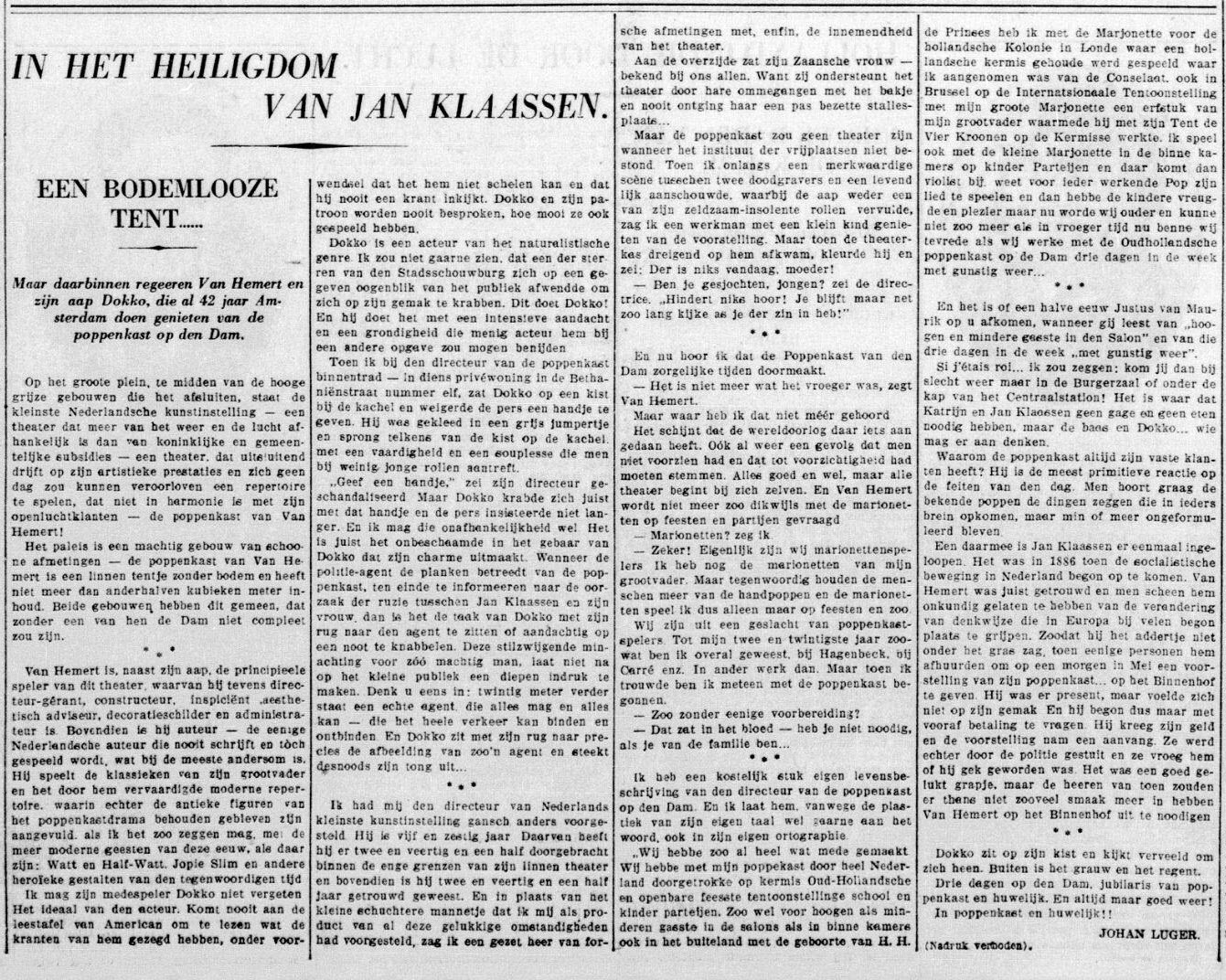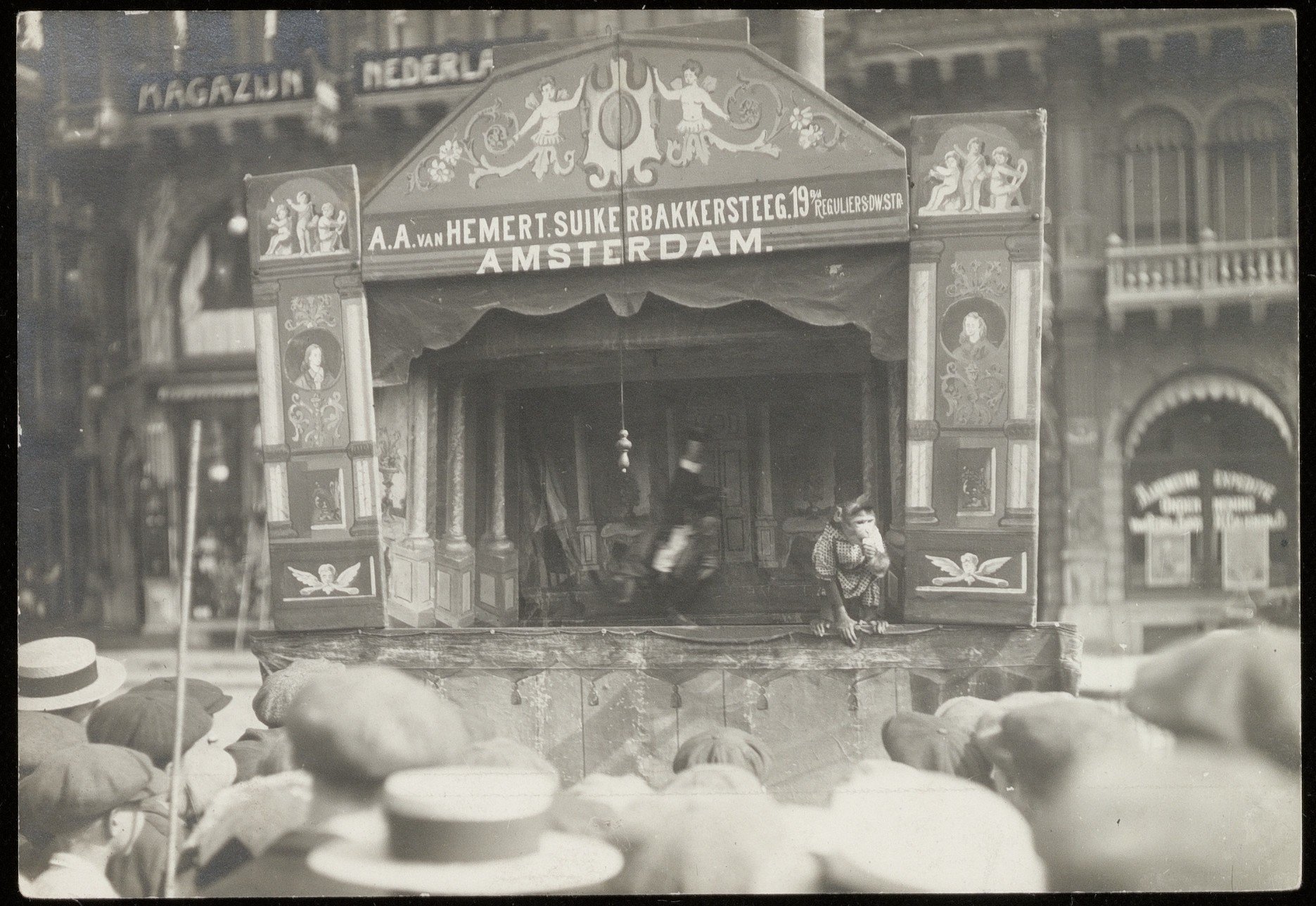 | Media object | Formaat: image/jpeg Afmetingen afbeelding: 775 × 503 pixels Bestandsgrootte: 70 KB Soort: Foto Notitie: Poppenkastspeler A.A. van Hemert in zijn poppenkast in Amsterdam. 1930-1935 |