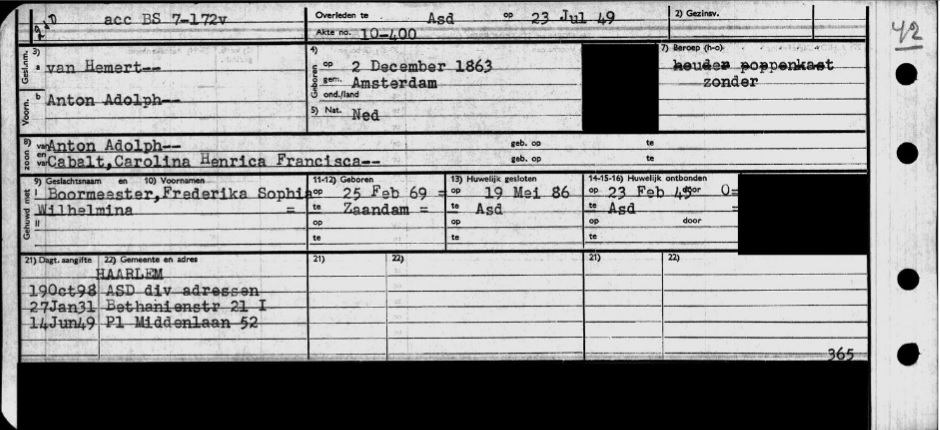 | Overleden | 23 juli 1949 (Leeftijd 85 jaar) Adres: Sint-Jacobgesticht, Plantage Middenlaan nr. 52 |