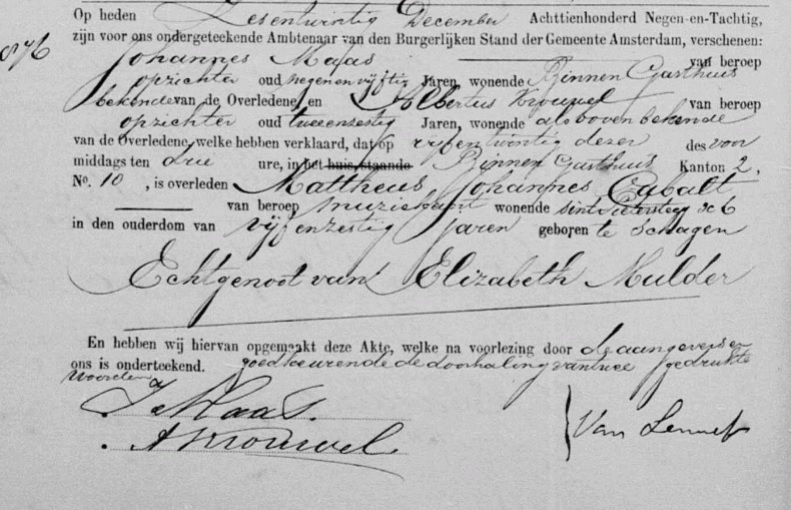 | Overlijden van vader | Mattheus Johannes Cabalt (Kabalt) 25 december 1889 – 03:00 (Leeftijd 31 jaar) Adres: Binnengasthuis. Kanton 2, nr 10 |