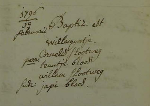 | Doop van een dochter | Willemijntje ‘Mijntje’ Slootweg 19 februari 1796 (Leeftijd 39 jaar) |