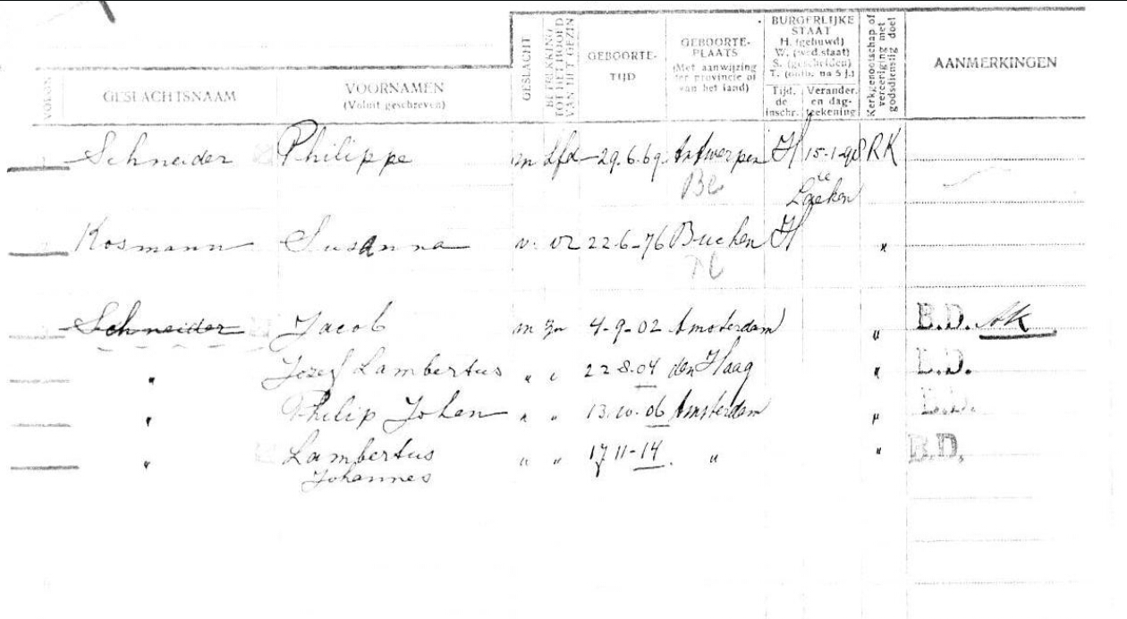 Opmerkingen: Philippe Schneider en Susanne Kossmann hebben bij de voltrekking van hun huwelijk te Laeken in België op 15 januari 1898 de eerste met toestemming van de tweede, dit kind erkend , en alzo gewettigd. De ambt. Burgerl. stand Utrecht, d e griffier van de