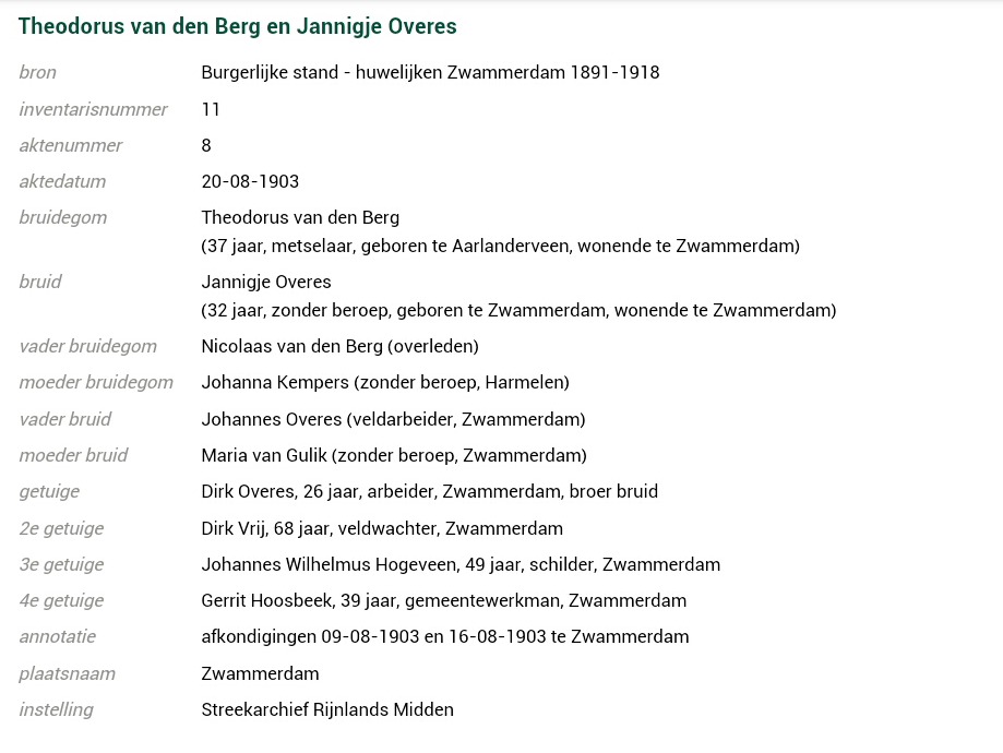 | Huwelijk van een kind | Theodorus van den Berg — Jannigje Overes — Bekijk dit gezin 20 augustus 1903 (Leeftijd 57 jaar) |