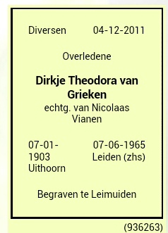 Dirkje Theodora van Grieken Geboren: 7 januari 1903 36 36 — Nieuwer-Amstel (N-H) Overleden: 7 juni 1965 — Leiden (Z-H) |