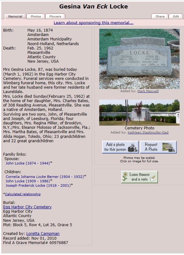 Gesina van Eck Geboren: 16 mei 1874 — Amsterdam (N-H) Overleden: 25 februari 1962 — Pleasantville Atlantic County New Jersey (USA) |