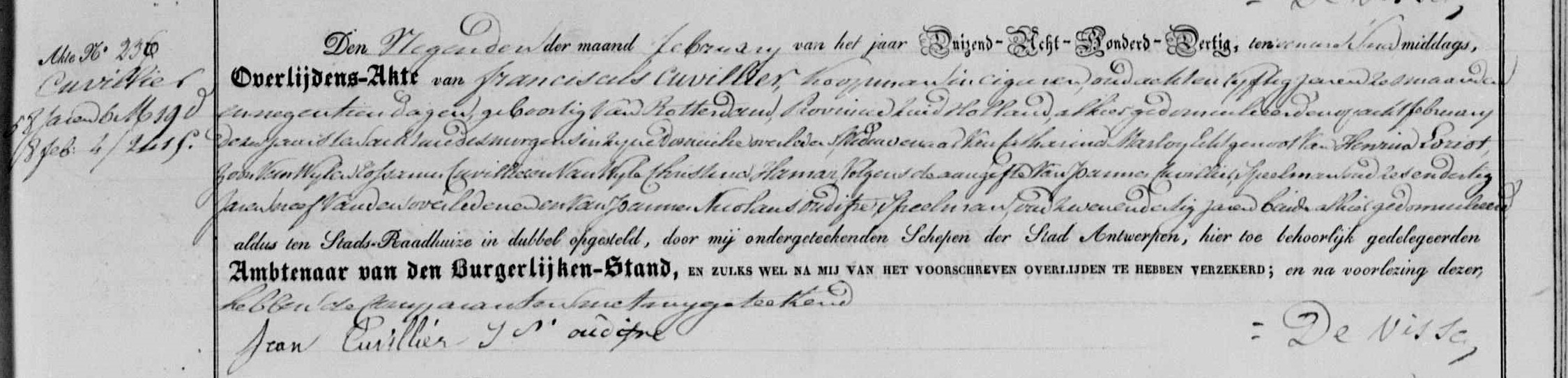 Franciscus Cuvillier Geboren: 1771 51 30 — Rotterdam (Z-H) Overleden: 8 februari 1830 — Antwerpen (België) |