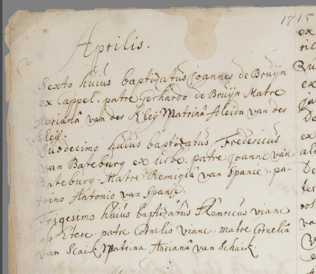 | Doop van een broer | Hendrik Cornelis Vianen 30 april 1715 (Leeftijd 10 jaar) Religie: Rooms-Katholiek |