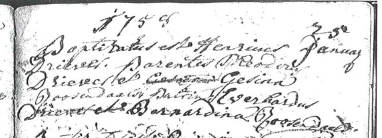 | Doop van een broer | Henricus Driever 25 januari 1758 (Leeftijd 6 jaar) Religie: Rooms-katholiek Notitie: Getuigen e.a.: Everhardus Driever en Bernardina Roosendaels |