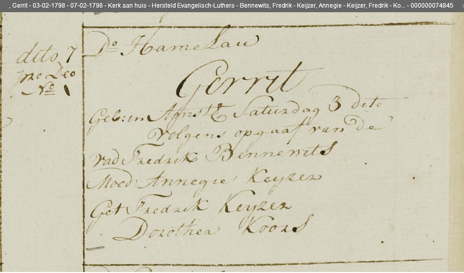| Gedoopt | 7 februari 1798 (Leeftijd 4 dagen) Adres: Kerk aan huis Religie: Hersteld Evangelisch-Luthers Notitie: Getuigen: Fredrik Keijzer en Dorothea Koors Notitie: Gedoopt door Johannes Hamelau |