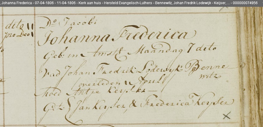 | Doop van een zus | Johanna Frederica Bennewitz 11 april 1806 (Leeftijd 8 jaar) Adres: Kerk aan huis Religie: Hersteld Evangelisch-Luthers |