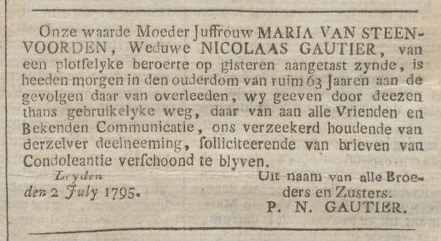 | Overlijden van een echtgenoot | Nicolas Gautier 1794 (Leeftijd 62 jaar) |