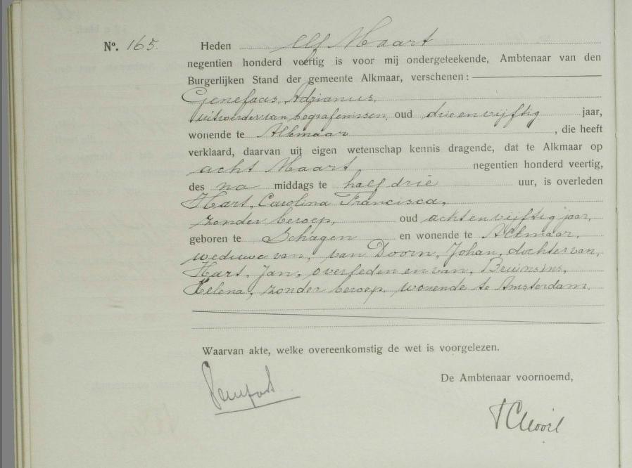 | Overlijden van een echtgenote | Carolina Francisca Hart 8 maart 1940 – 14:30 uur (Leeftijd 55 jaar) |