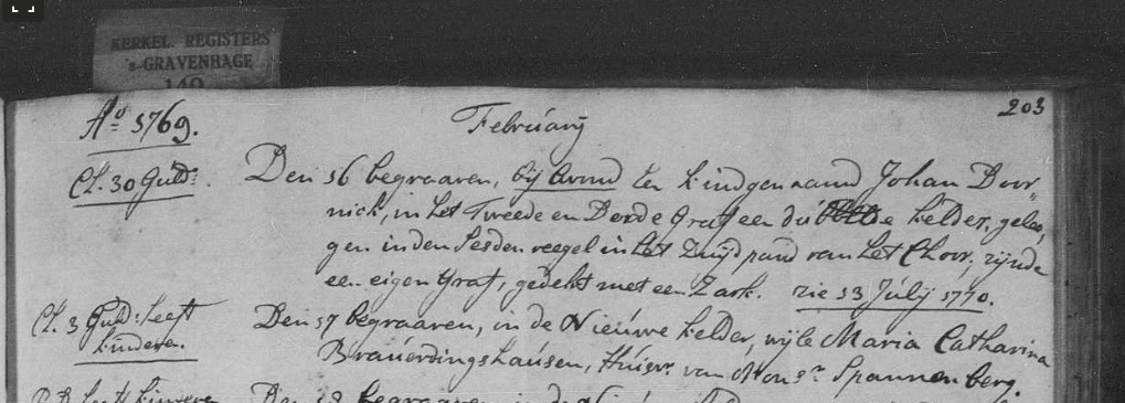 | Begrafenis van een echtgenote | Maria Catharina Barones Von Brauerdingshausen 17 februari 1769 (Leeftijd 49 jaar) Adres: Nieuwe kelder |
