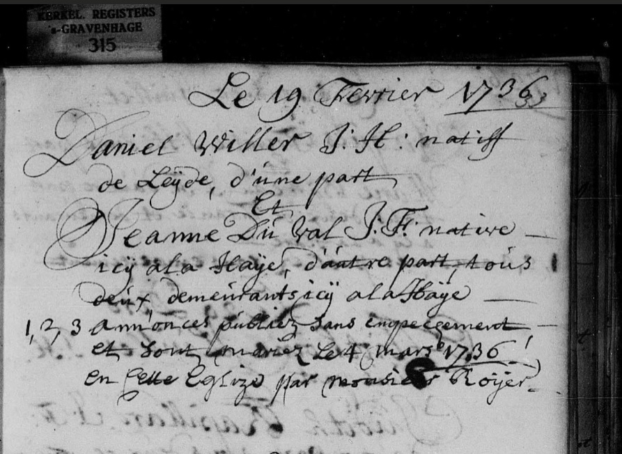 | Kerkelijk huwelijk | Daniel Willer — Bekijk dit gezin 19 februari 1736 Religie: Waals-hervormde |