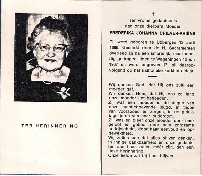 | Overlijden van een echtgenoot | Gerardus Bartholomeus Driever 14 augustus 1953 (Leeftijd 67 jaar) |