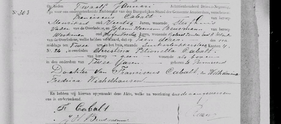 | Overlijden van een kleindochter | Christina Petronella Cabalt (Kabalt) 10 januari 1893 – 02:00 (Leeftijd 65 jaar) Adres: Suikerbakkersteeg. Kanton 4, nr. 26. |