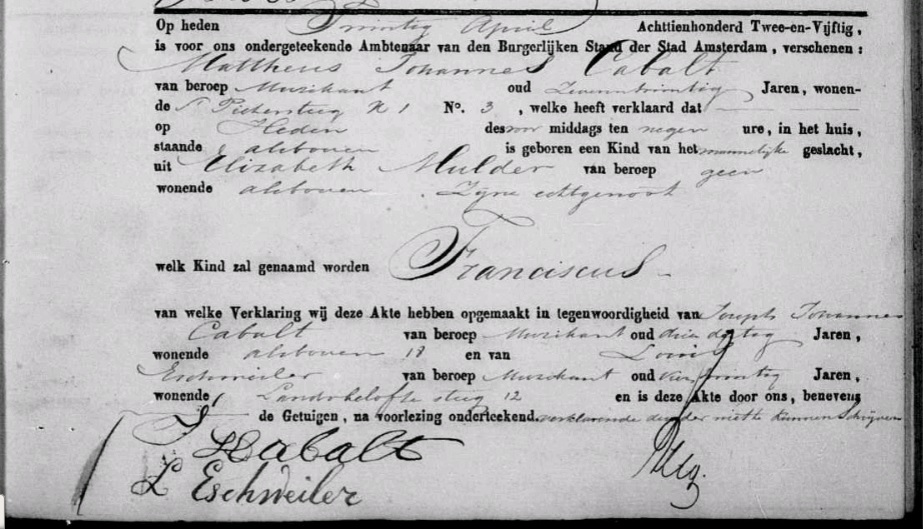 | Geboorte van een broer | Franciscus Cabalt (Kabalt) 20 april 1852 – 09:00 (Leeftijd 2 jaar) Adres: Sint Pietersteeg Wijk 1, nr. 3 |