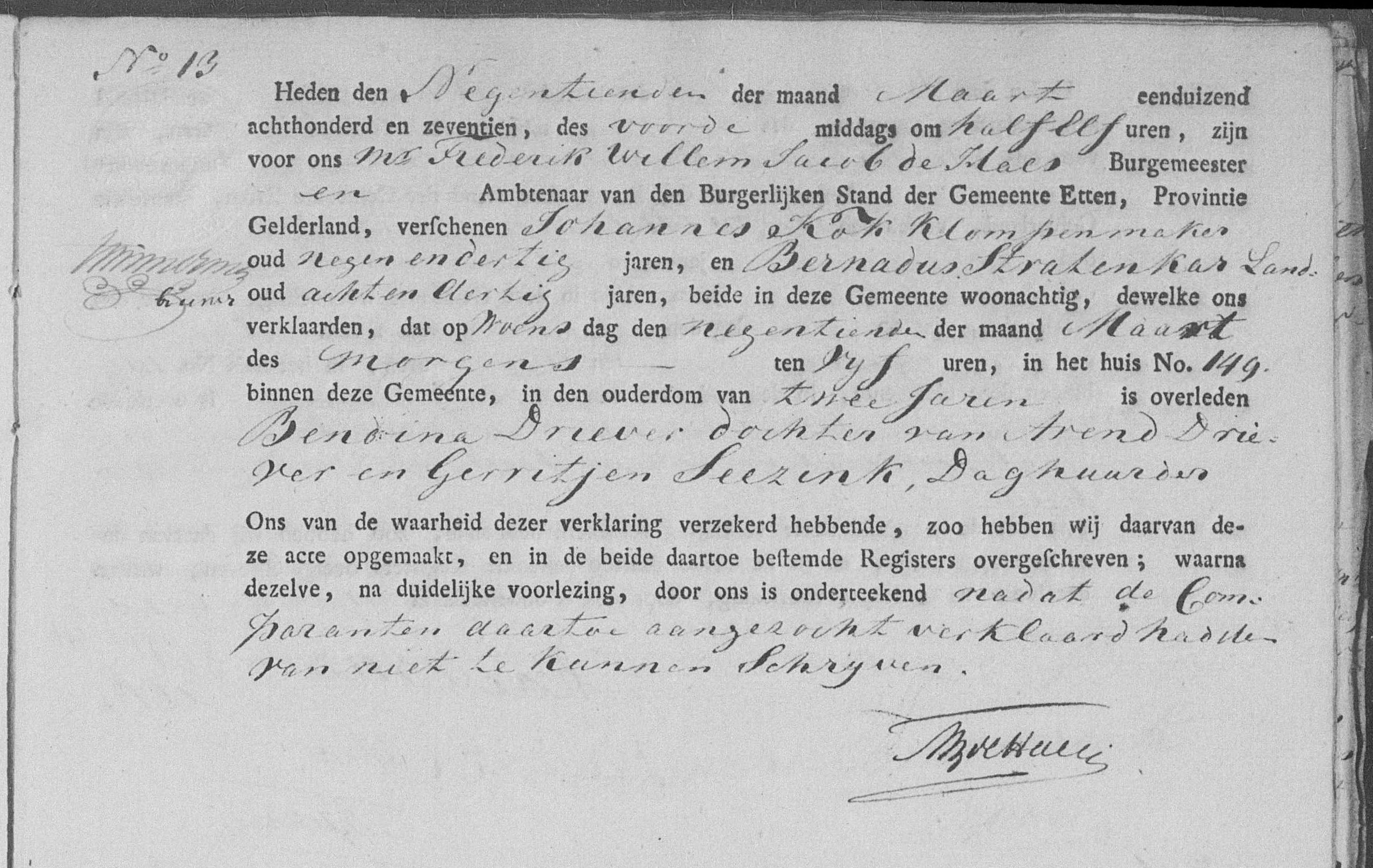 | Overlijden van een dochter | Berendina Driever tussen 19 en 23 maart 1817 Adres: Nr. 149 |