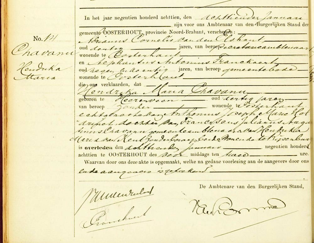 | Overlijden van een echtgenote | Hendrika Maria Chavanu 18 januari 1918 – 14:00 uur (Leeftijd 36 jaar) |