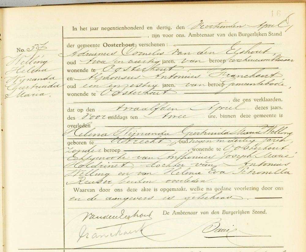 Helena Wijnanda Geertruida Maria Welling Geboren: 28 mei 1890 35 35 — Utrecht (Utrecht) Overleden: 12 april 1930 — Oosterhout (N-B) |
