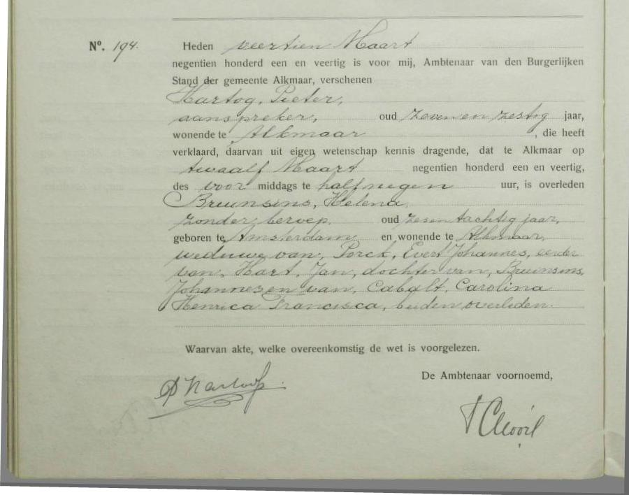 | Overlijden van grootmoeder van vaders kant | Helena Bruinsins 12 maart 1941 (Leeftijd 28 jaar) |