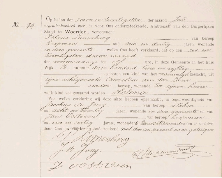 | Geboorte van een dochter #2 | Helena Lunenburg 26 juli 1904 – 11:00 (Leeftijd 31 jaar) Adres: Wijk B, nr. 352 |