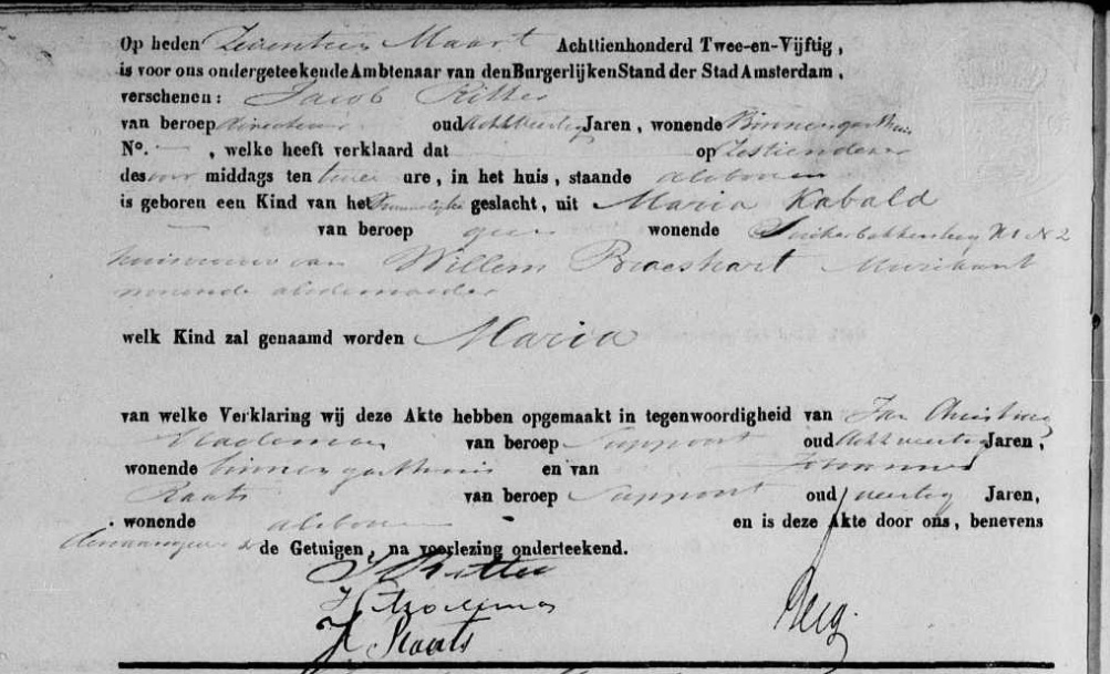 | Geboorte van een dochter #1 | Maria Broeshart 16 maart 1852 (Leeftijd 30 jaar) Adres: Binnengasthuis |