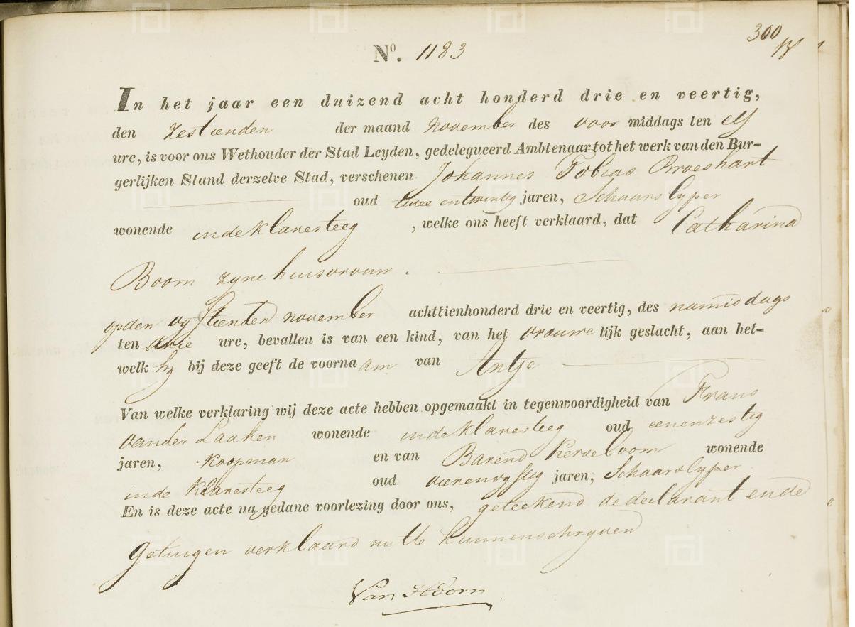 | Geboorte van een kleindochter #1 | Antje Broeshart 15 november 1843 – 15:00 (Leeftijd 59 jaar) Adres: Klarasteeg |