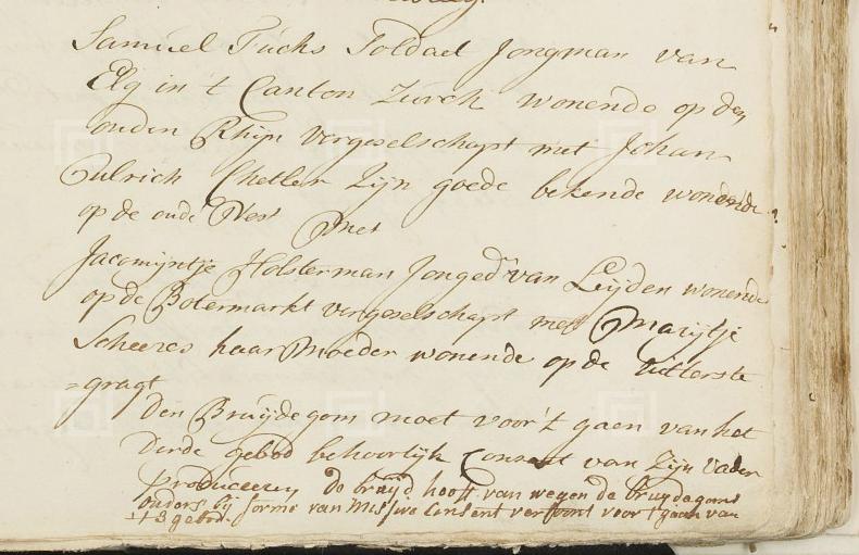 Opmerkingen Getuigen bruidegom: Johan Ulrich Chetler bekende Oude Vest - Getuigen bruid: Marijtje Scheeres moeder Uitterstegragt - Bruyd heeft vanwege bruidegoms ouders by forme van missere consent vertoont. |