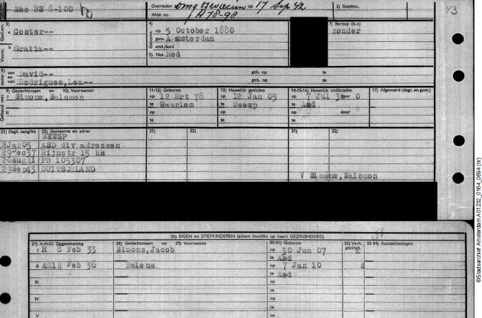 | Gratia Coster Gratia Simons | 5 oktober 1880 | 145 | Amsterdam (N-H) | 3 | 17 september 1942 | 83 | 61 | Auschwitz (Polen) | F | YES | Y100 | |||||