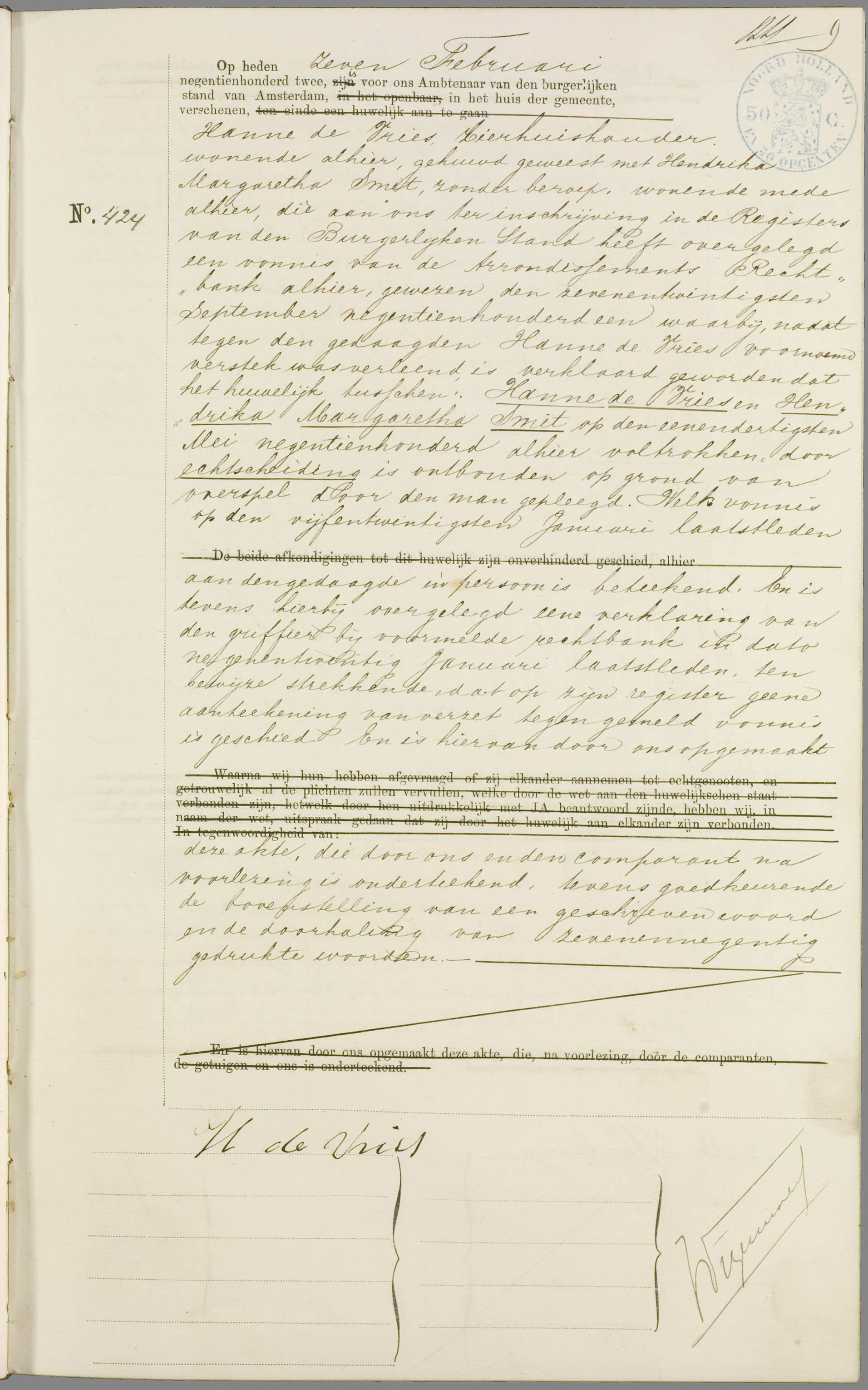 Scheidingsakte Hanne de Vries en Hendrika Margaretha Smit
