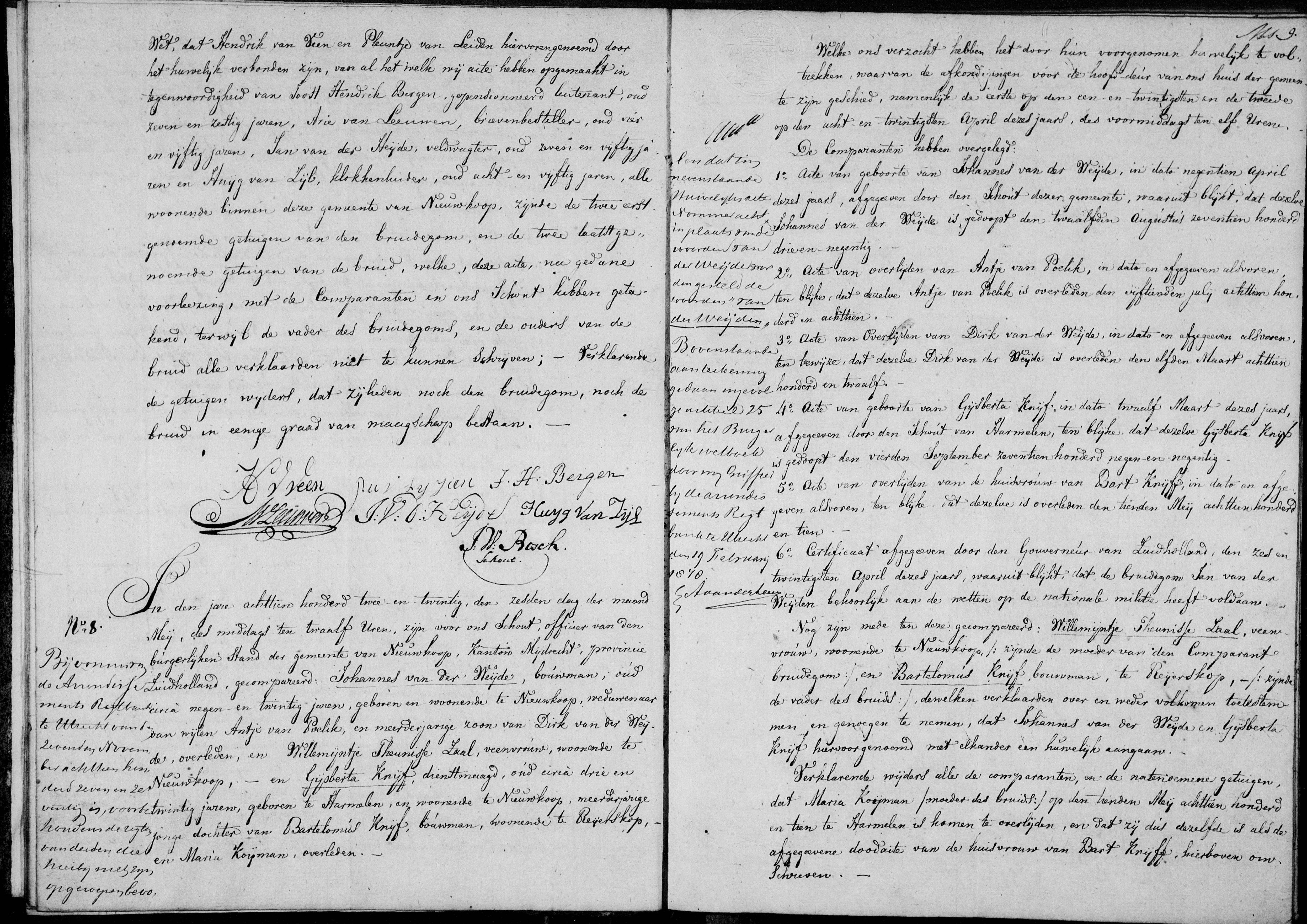 Huwelijksakte Johannes van der weijden en Gijsberta Knijf. Nieuwkoop 1822. Blz.1