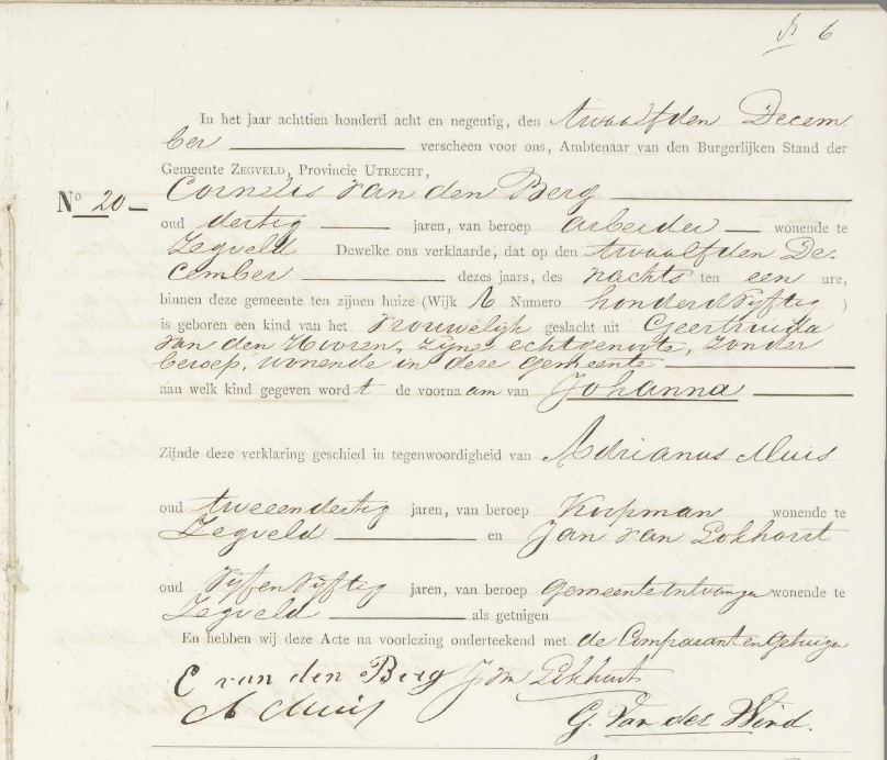 Geboorteakte Johanna van den Berg 12-12-1898 Zegveld