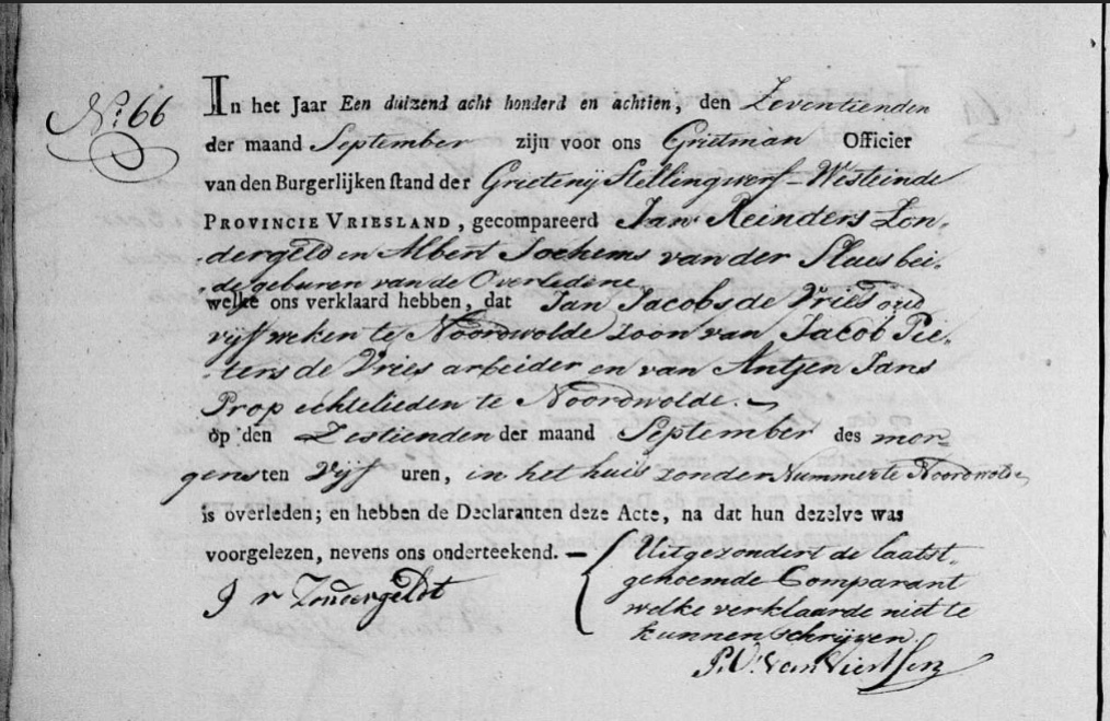 Overlijdensakte Jan Jacobs de Vries 16-9-1818 Noordwolde