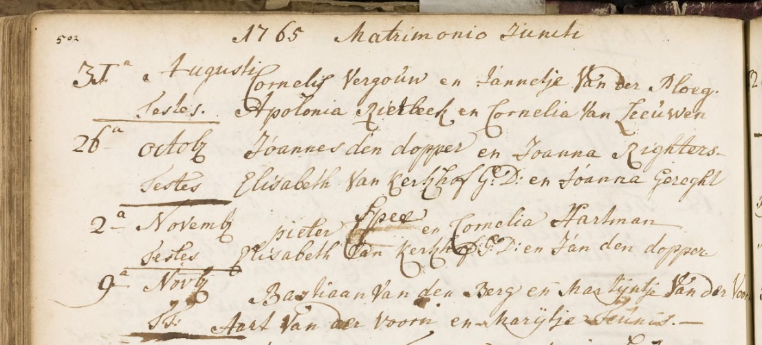 Huwelijksregister van de kerk aan de St. Jorissteeg te Leiden 9-11-1765